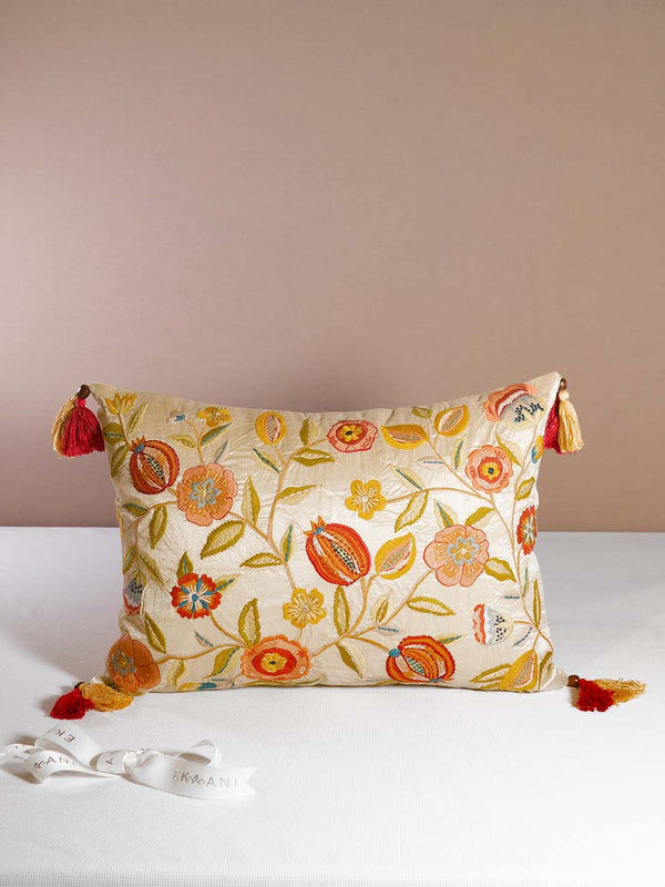 Pomegranate Dubion Silk With Multicolor Thread Embroidery Ivory Cushion