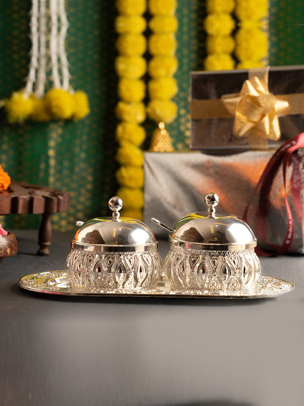 This stunning vintage Oval Tray with bowls is the ideal serving kitchenware. This vintage piece is a better fit for serving food and fruits at occasion. The intricate pattern on...