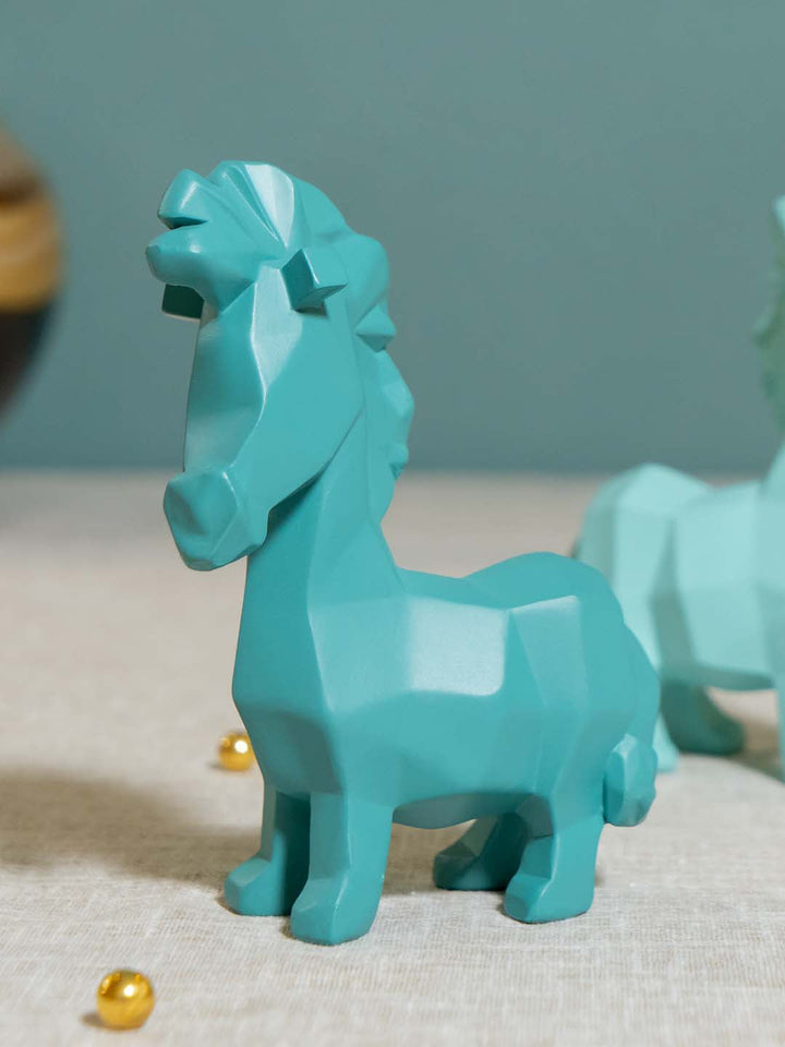 Ekaani Home's Abstract Small Pony (Teal Green) Sculpture with its vibrant hues and angular style brings forth a sprightly joyfulness to any surrounding. Tinted teal green, the pony’s classical as a fantastical creature, adds an air of magic and nurtures the imagination. It creates a statement piece with its clean lines and popping colours.