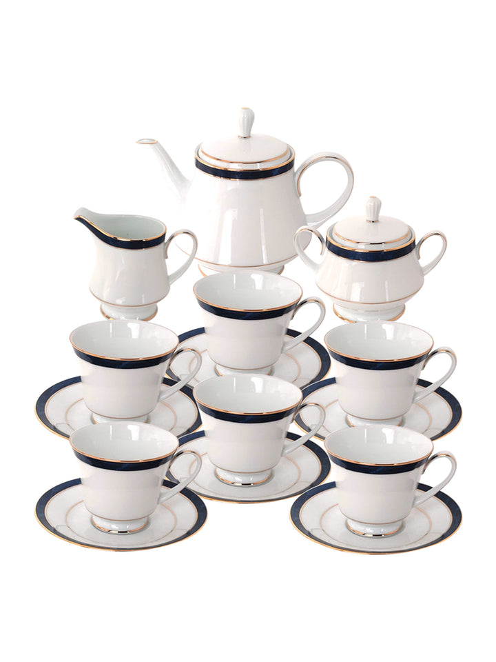 - Net Qty: 17 Pcs Tea Set Includes 6 Cup and Saucer Set Tea Pot 1 Milk Pot 1 lid 1 Tea Pot 1 lid 1 Sugar Pot