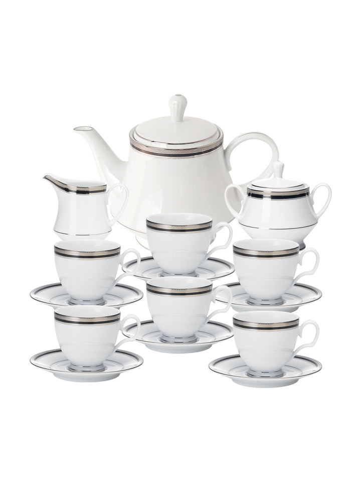 - Net Qty: 17 Pcs Tea Set Includes 6 Cup and Saucer Set Tea Pot 1 Milk Pot 1 lid 1 Tea Pot 1 lid 1 Sugar Pot