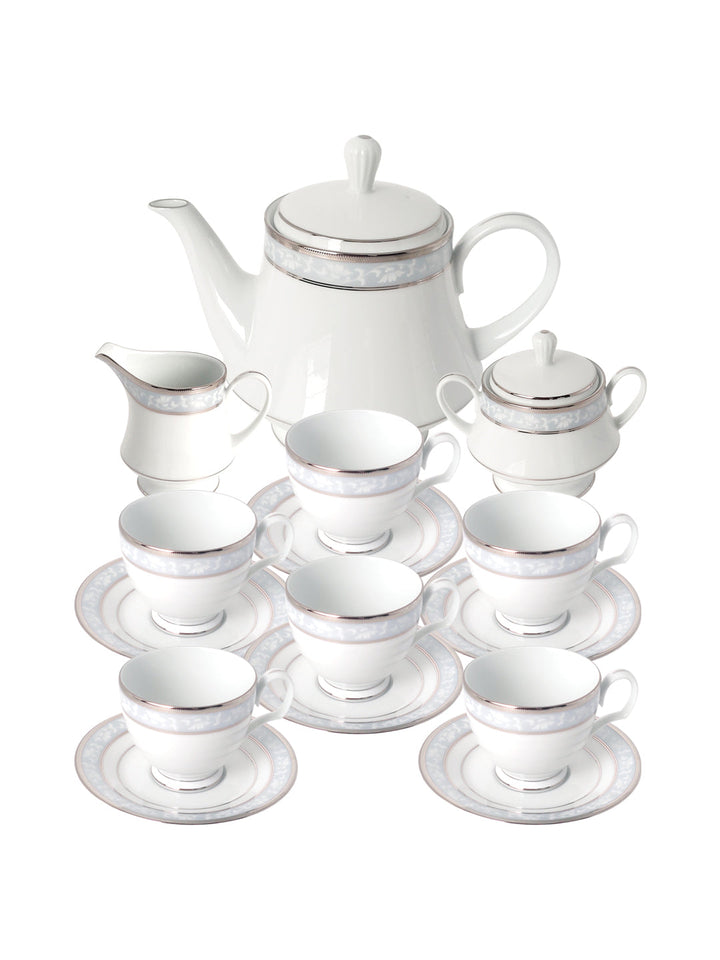 - Net Qty: 17 Pcs Tea Set Includes 6 Cup and Saucer Set Tea Pot 1 Milk Pot 1 lid 1 Tea Pot 1 lid 1 Sugar Pot