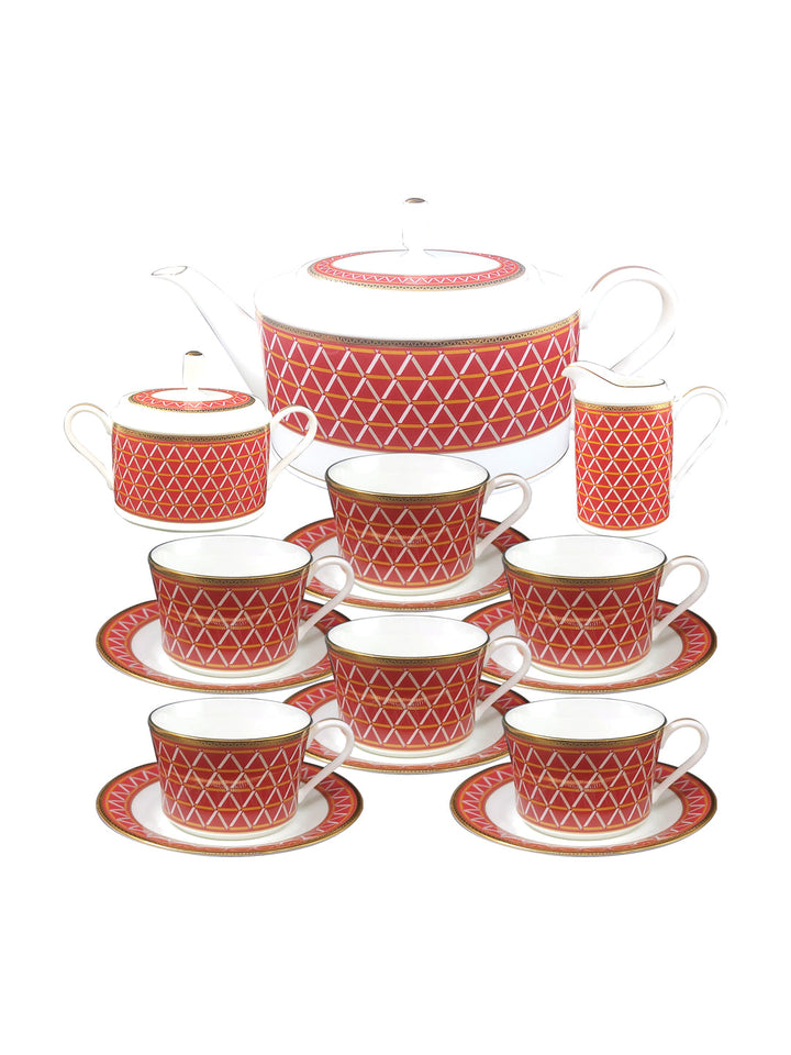 - Net Qty: 17 Pcs Tea Set Includes 6 Cup and Saucer Set Tea Pot 1 Milk Pot 1 lid 1 Tea Pot 1 lid 1 Sugar Pot