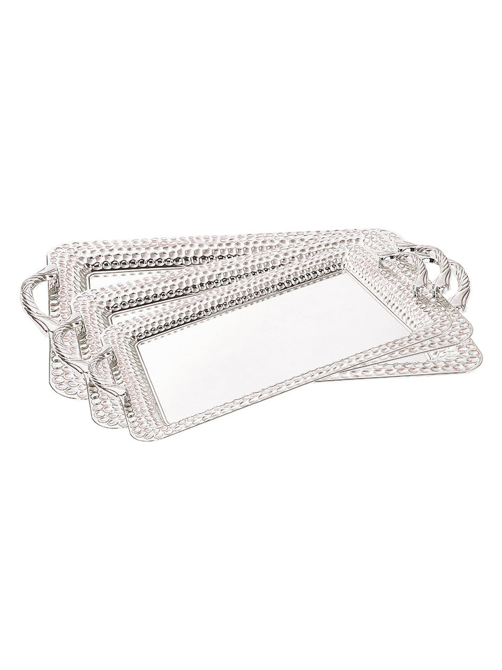 This dotted tray with two handles is ideal for beverage service or tray-passed appetizers at an event. The tray has beautifully detailed dotted borders with clean finishing. You can purchase this elegant piece of an antique tray from the house of Ekaani. The is the dotted tray with dimensions 32 X 20 CM