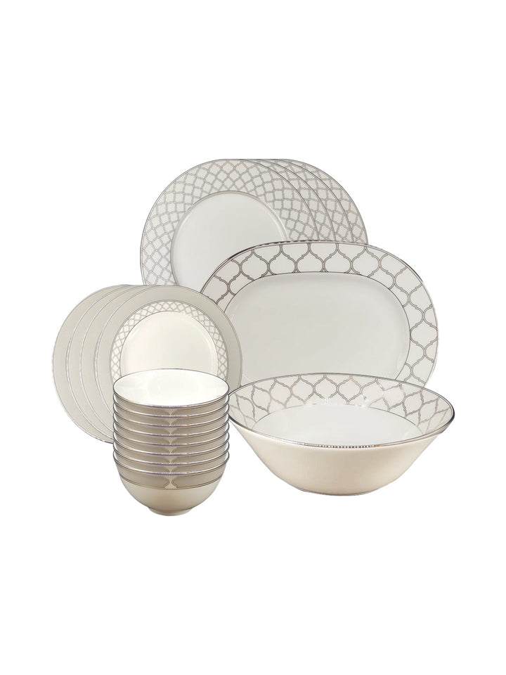- Net Qty: 18 Pcs Dinner Set includes 4 Dinner Plates 4 Half Plates 8 Veg Bowls 1 Oval Platter 1 Serving Bowl