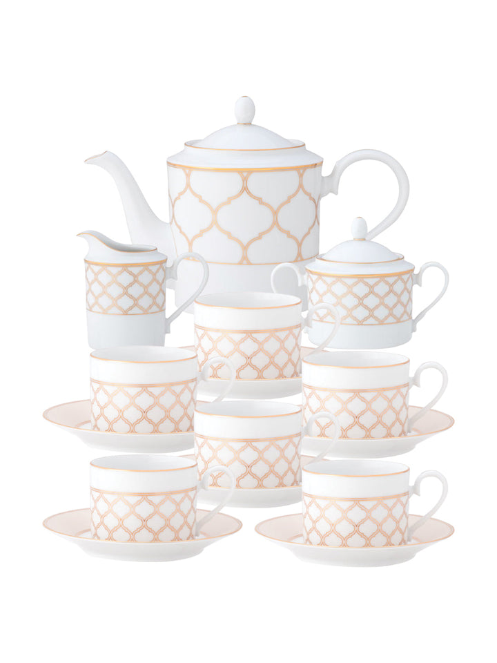 - Net Qty: 17 Pcs Tea Set Includes 6 Cup and Saucer Set Tea Pot 1 Milk Pot 1 lid 1 Tea Pot 1 lid 1 Sugar Pot