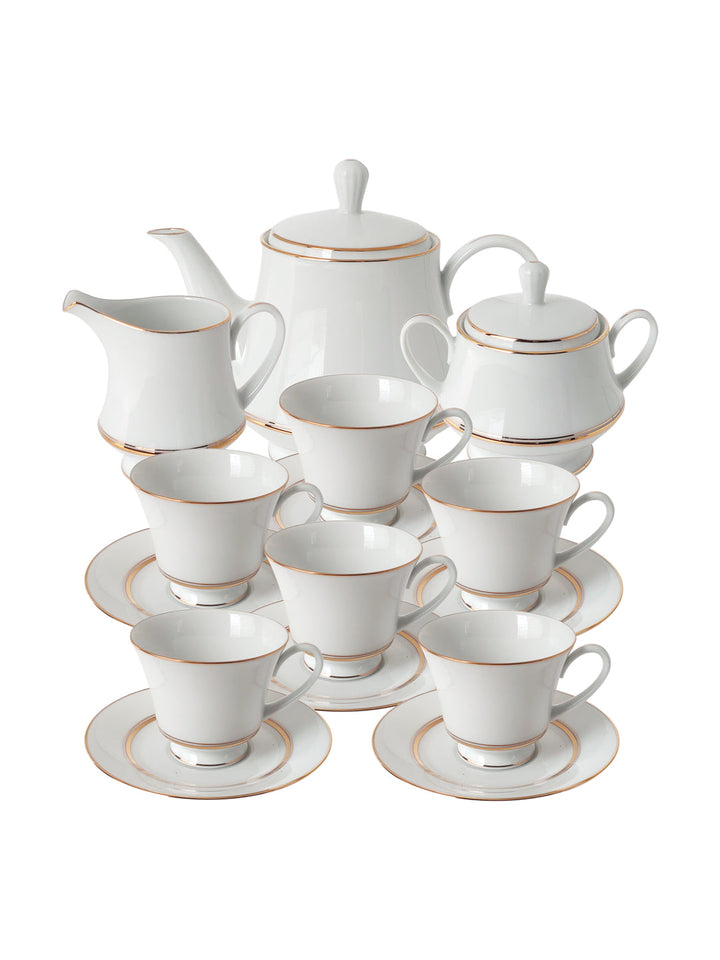 - Net Qty: 17 Pcs Tea Set Includes 6 Cup and Saucer Set Tea Pot 1 Milk Pot 1 lid 1 Tea Pot 1 lid 1 Sugar Pot