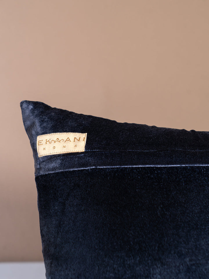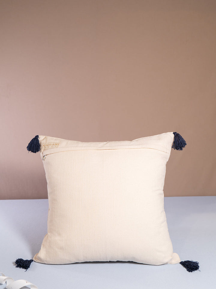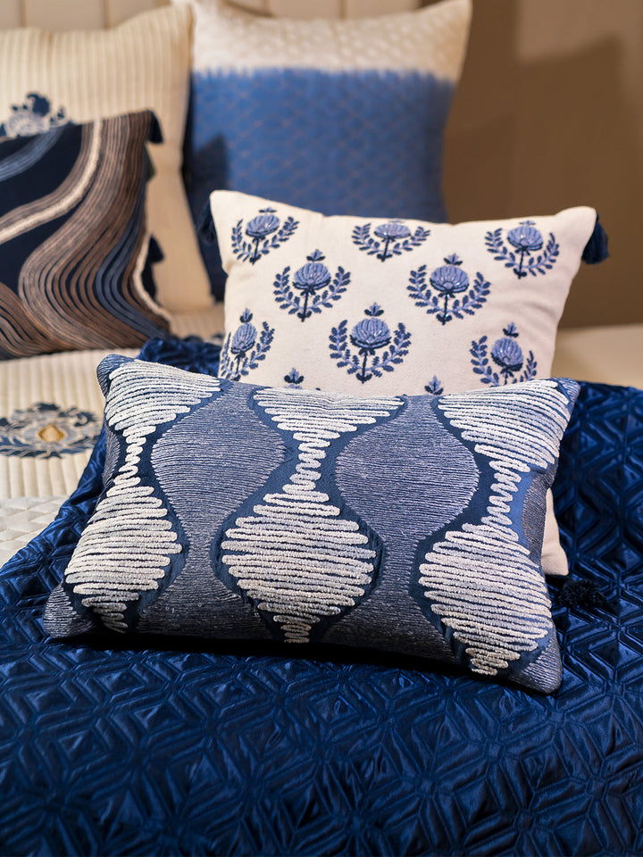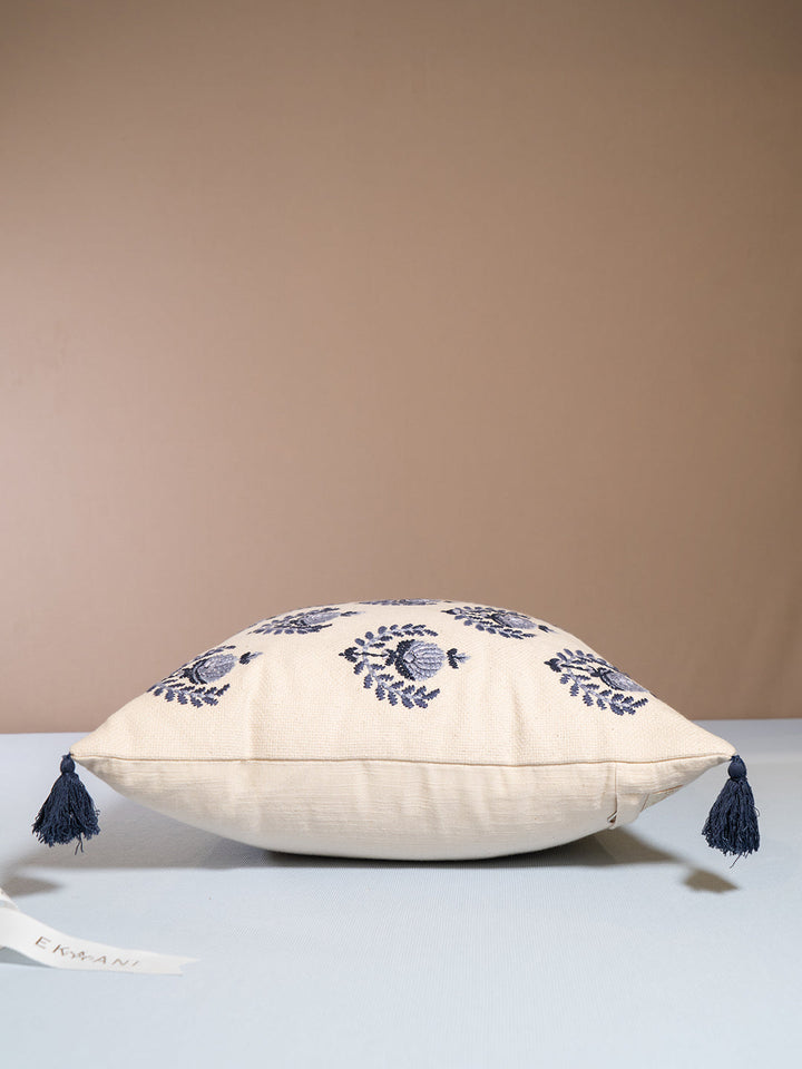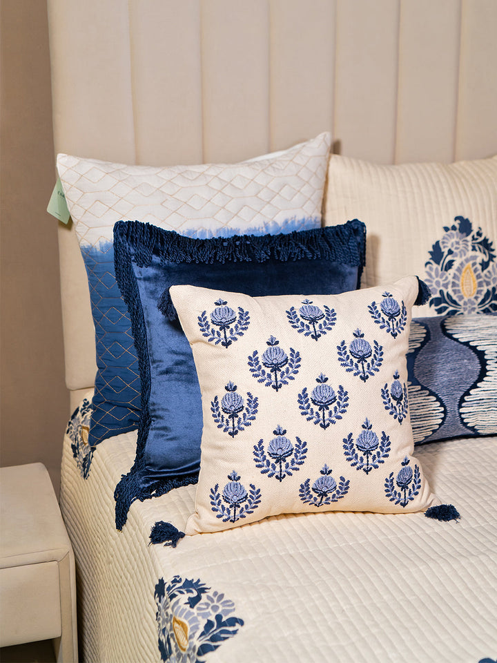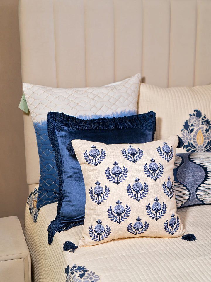 Indigo Cotton Textured Slub With Thread Embroidery & Adda Work Ivory Cushion
