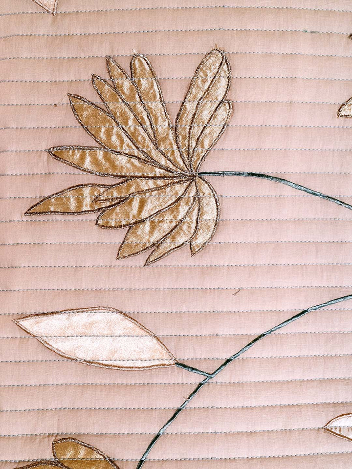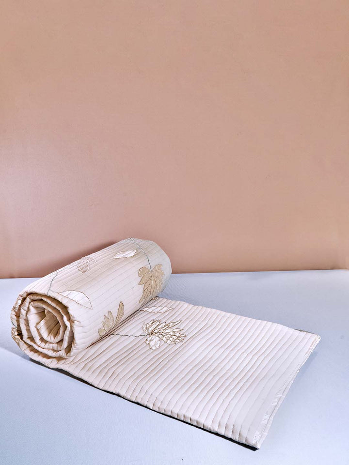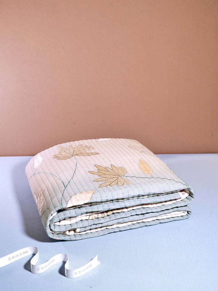 Lotus Bedcover Cotton Mul With Ombre Shading Patch Work Of Velvet & Silk & Thread Embroidery Ivory To Teal Bedcover