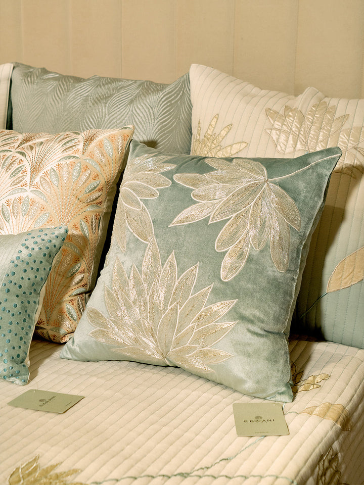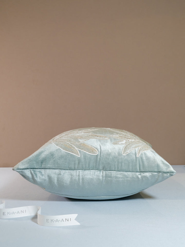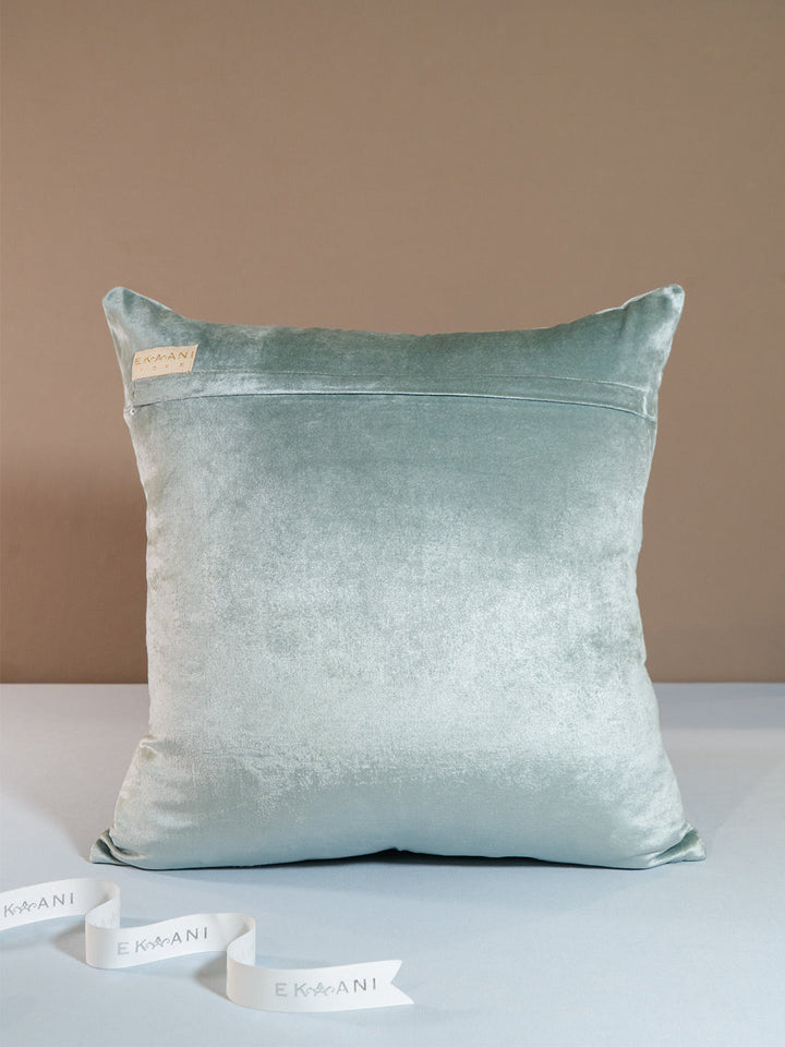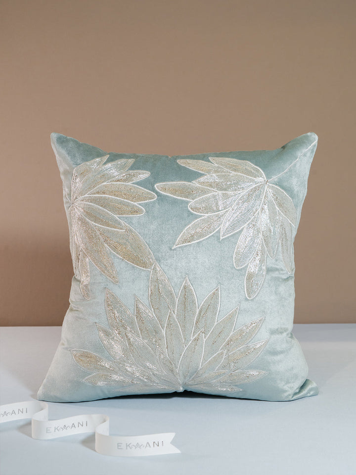 Description: The grandeur of Ekaani's Lotus Lily With Zari Work On Viscose Velvet Teal Cushion, made with sumptuous viscose velvet in a calming teal color. The enchanting lotus lily pattern, delicately embroidered with sparkling Zari threads, adds a touch of elegance and refinement.