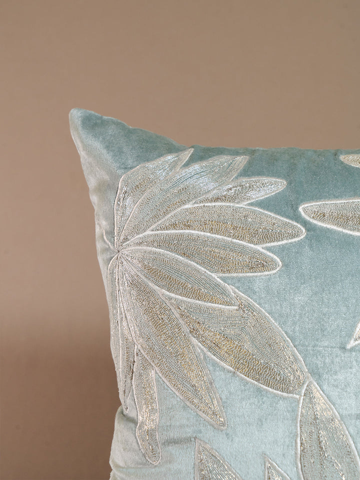 Lotus Lily With Zari Work On Viscose Velvet Teal Cushion