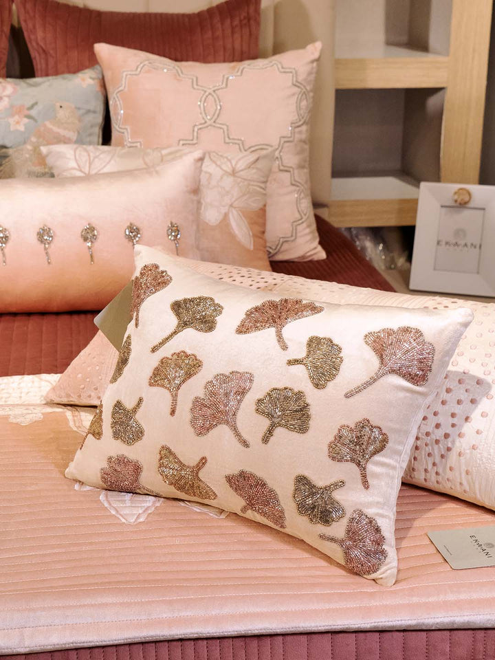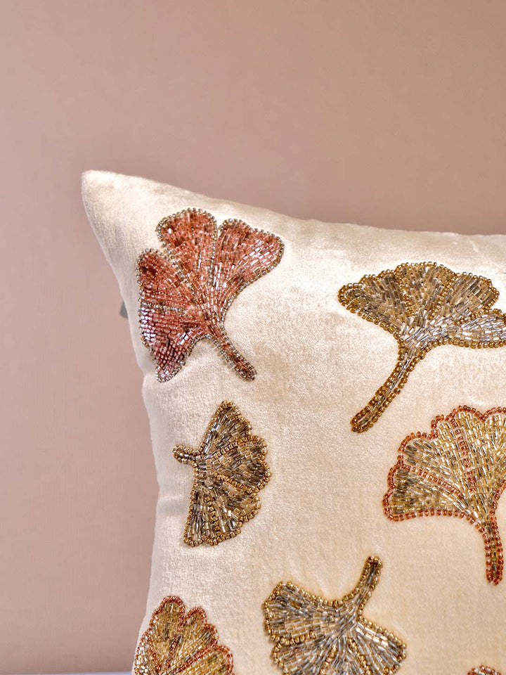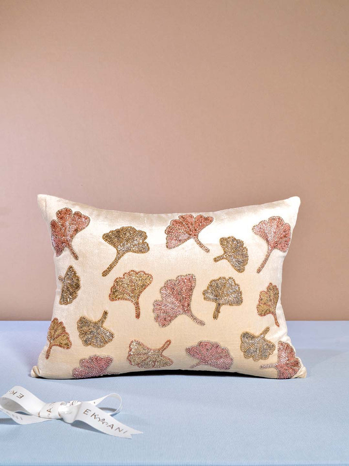 Description: Ekaani’s Lotus cushion is made of soft and luxurious viscose velvet, giving it a refined and comfortable feel. The intricate embroidery on the cushion forms a captivating ginkgo leaf pattern, adding a touch of natural beauty to your surroundings. The soothing ivory colour of the cushion enhances the serene atmosphere it creates.