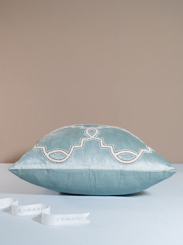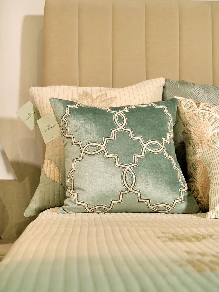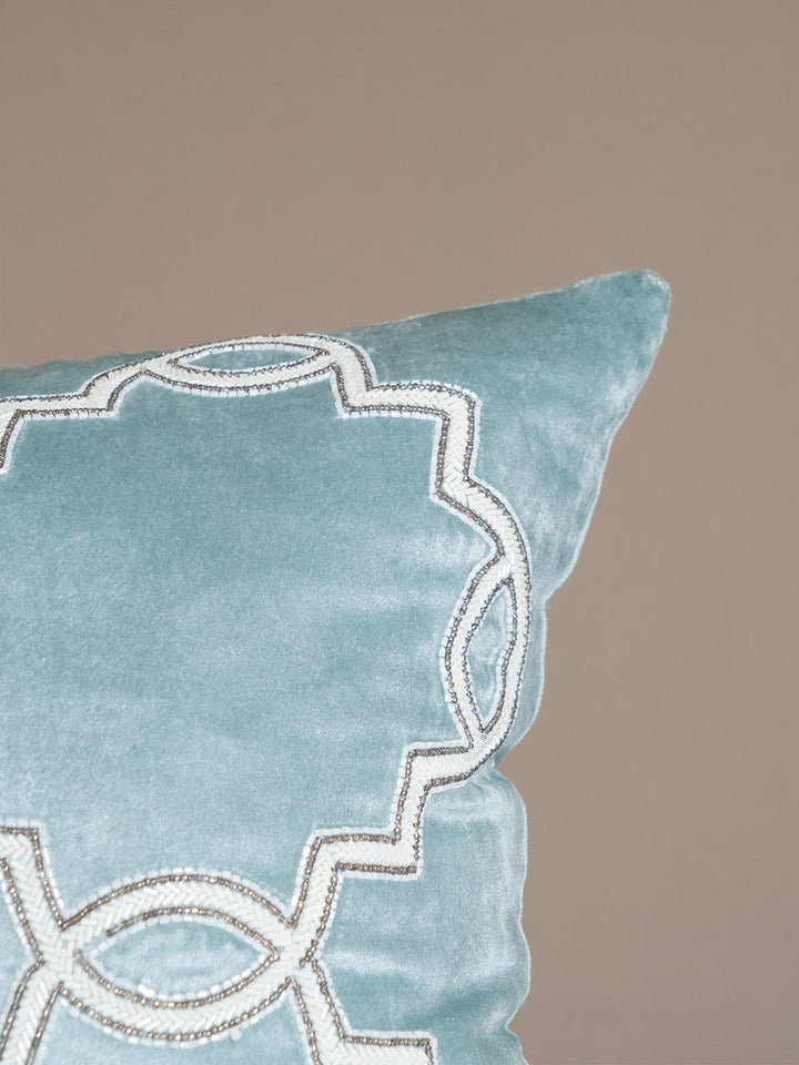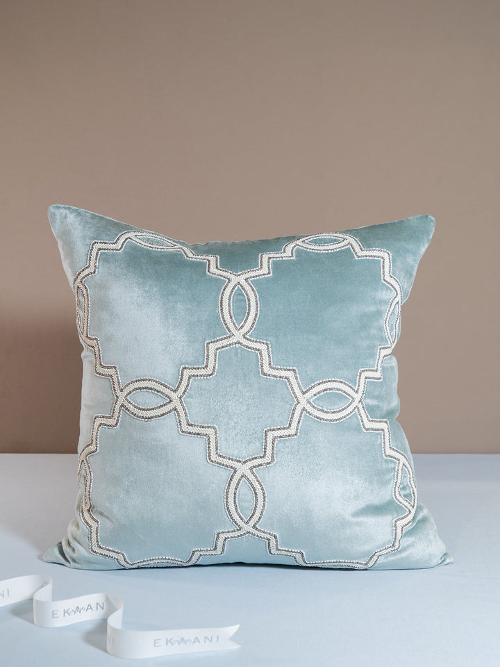 Description: The Lotus Viscose Velvet Teal Cushion showcases luxurious viscose velvet in a soothing hue, features a captivating geometric pattern meticulously embroidered with pipe adda work. The intricate stitches and shimmering threads add elegance and depth to the design.