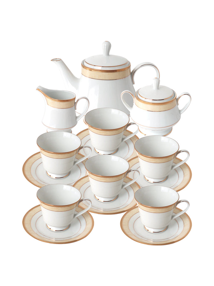 - Net Qty: 17 Pcs Tea Set Includes 6 Cup and Saucer Set Tea Pot 1 Milk Pot 1 lid 1 Tea Pot 1 lid 1 Sugar Pot
