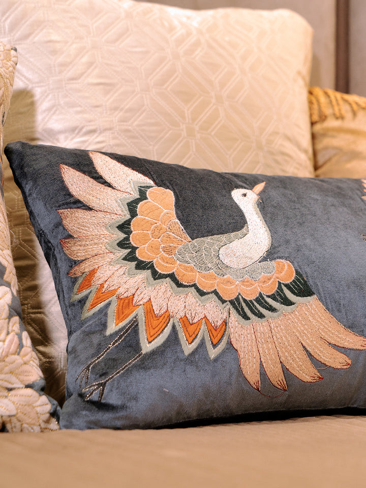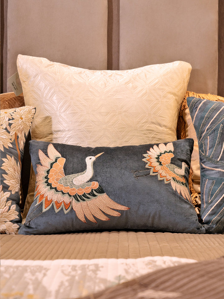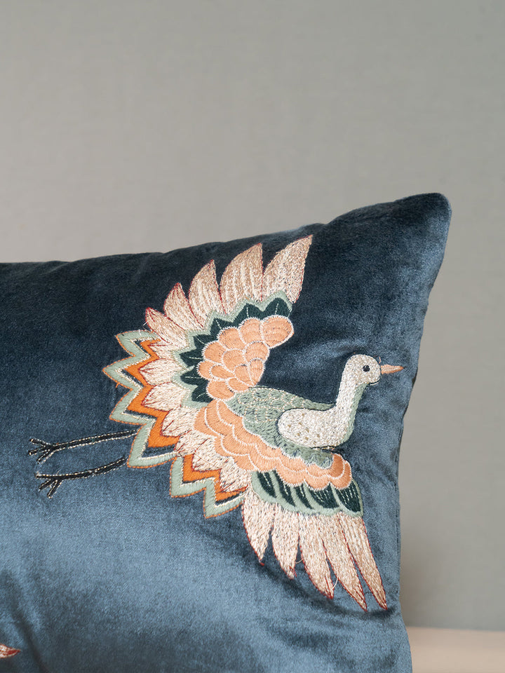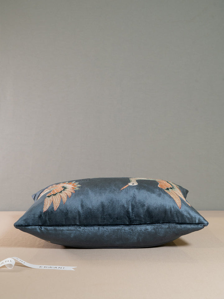Description: Ekaani’s Nature viscose velvet Cushion features a rich dark teal background and expertly embroidered two majestic swans, capturing every detail with precision and elegance. Crafted from the finest viscose velvet, this luxurious cushion cover envelops you in exceptional softness and comfort, while its plush texture and exquisite embroidery add a touch of luxury to any space.