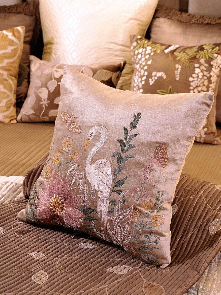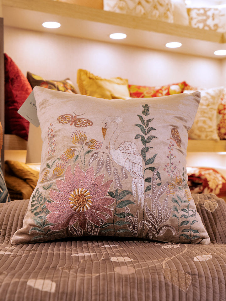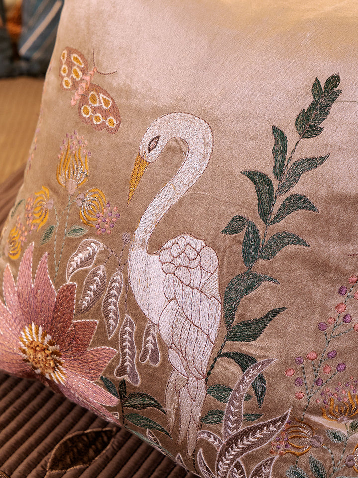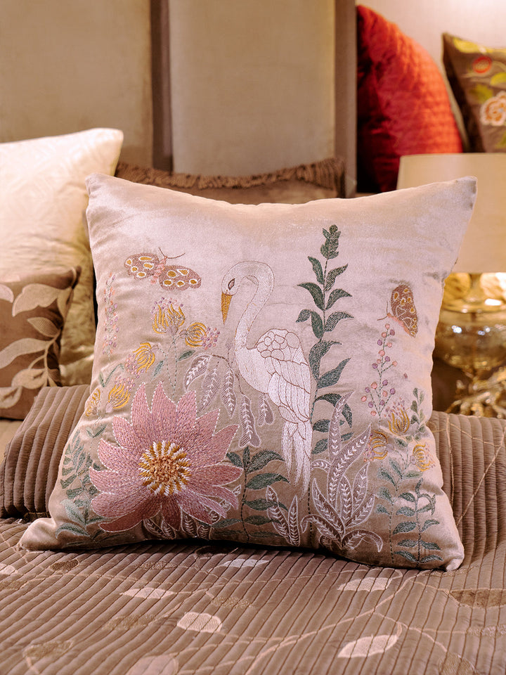 Description: Ekaani's Nature Viscose Velvet Cushion offers a tranquil oasis with exquisite design. The cushion features an intricately embroidered majestic swan on a soft beige canvas, creating a serene and elegant ambience. The plush velvet material provides unparalleled comfort, elevating the living space into a tranquil haven.