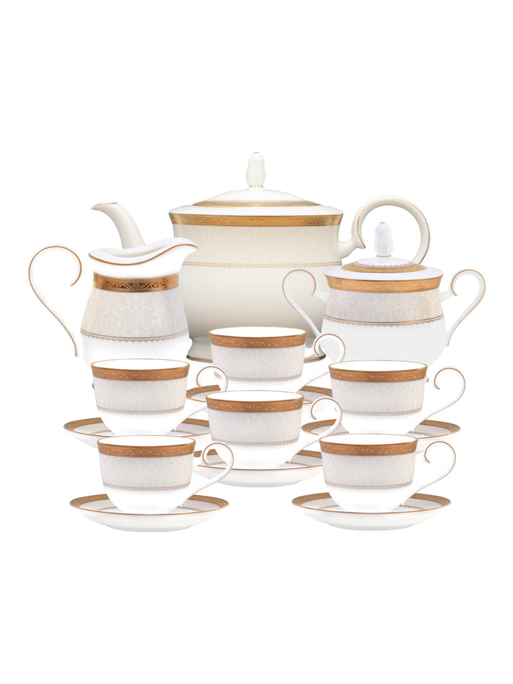 - Net Qty: 17 Pcs Tea Set Includes 6 Cup and Saucer Set Tea Pot 1 Milk Pot 1 lid 1 Tea Pot 1 lid 1 Sugar Pot