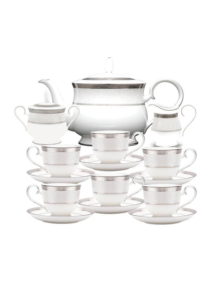 - Net Qty: 17 Pcs Tea Set Includes 6 Cup and Saucer Set Tea Pot 1 Milk Pot 1 lid 1 Tea Pot 1 lid 1 Sugar Pot