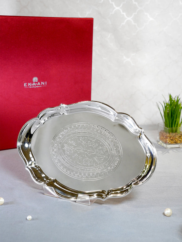 Silver Plated Hand trimmed beautiful oval tray from Ekaani is a classic selection for the home. The tray is generously silver plated and showcases a vintage design. The signature oval shape creates a striking presentation on the dining table. A tray is compiled with elegant motif design and engraved borders. Available dimentions is 30 X 20 CM