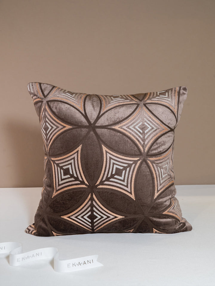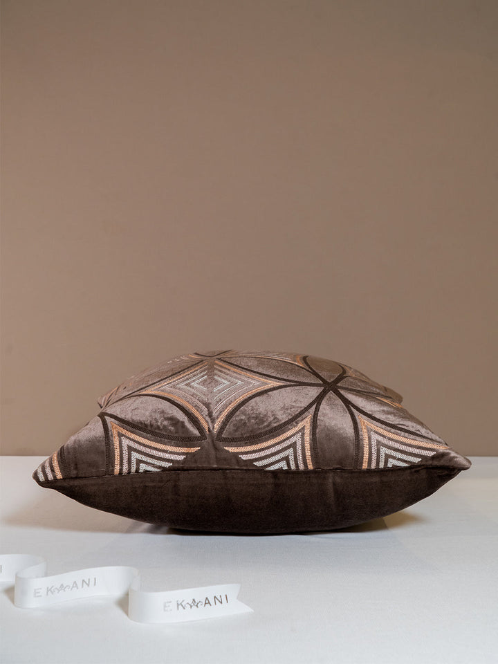 Description: The artistry of our Ekaani's special Aari Work Cushion from pomegranate collection. Handcrafted with precision, this cushion features intricate embroidery on a luxurious brown velvet background. The geometric patterns and warm brown hue create a captivating piece that adds a touch of elegance to any room.