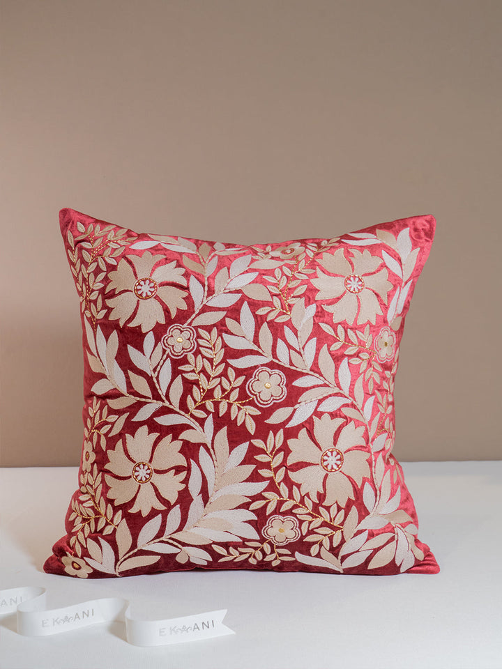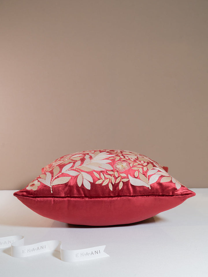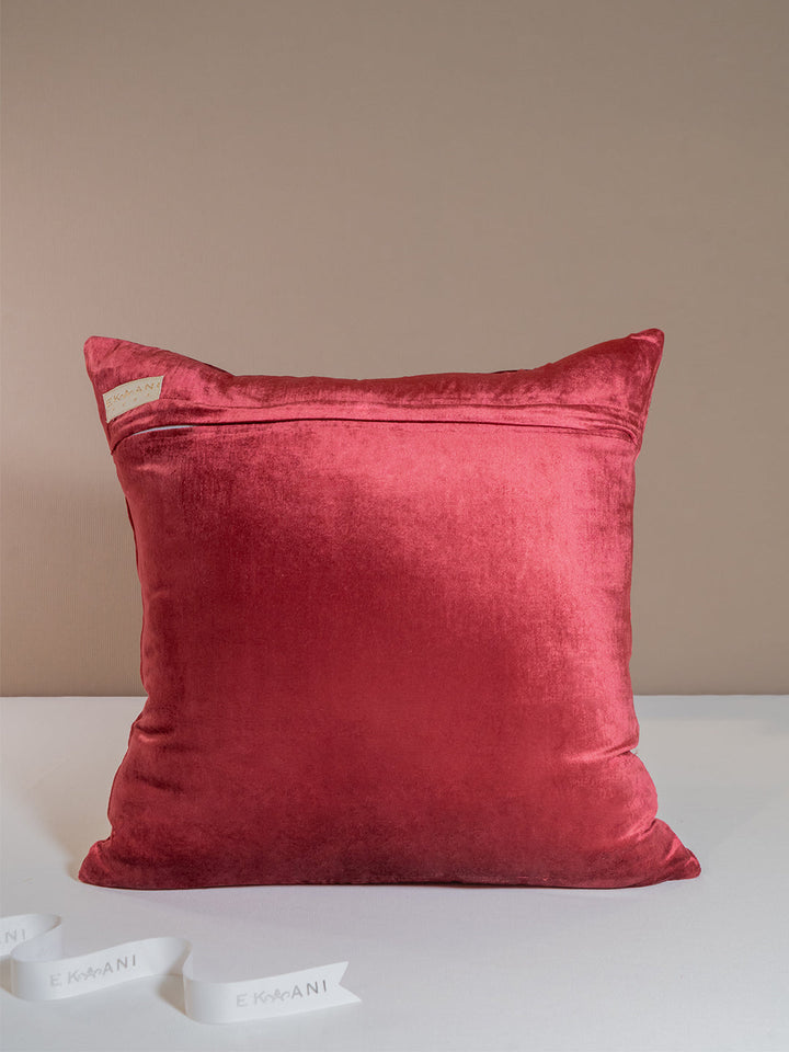 Description: Ekaani's Pomegranate Collection Viscose Velvet cushion piece is a luxurious blend of viscose velvet adorned with exquisite thread and Zari embroidery showcasing meticulously crafted floral motifs that captivate the eye. The rich pomegranate color exudes warmth and sophistication, while the sparkling Zari thread adds a touch of glamour. Crafted from the finest materials with exceptional attention to detail, this cushion is not just decor - it's a work of art that will enhance any space.