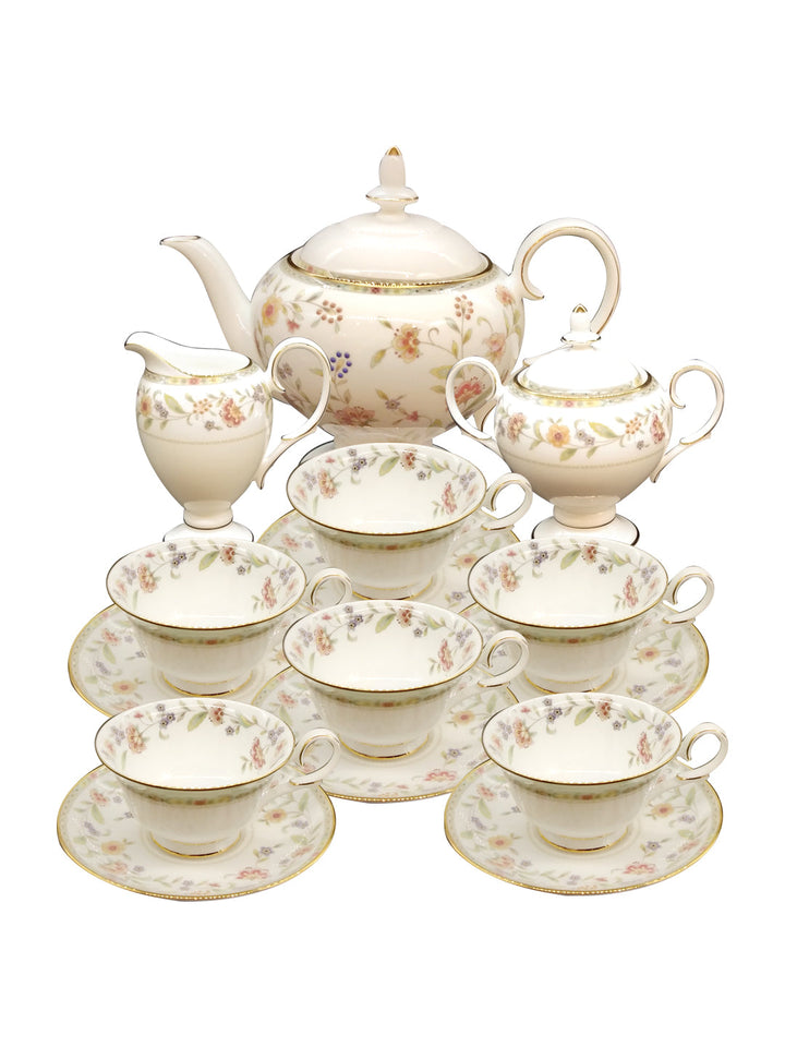 - Net Qty: 17 Pcs Tea Set Includes 6 Cup and Saucer Set Tea Pot 1 Milk Pot 1 lid 1 Tea Pot 1 lid 1 Sugar Pot