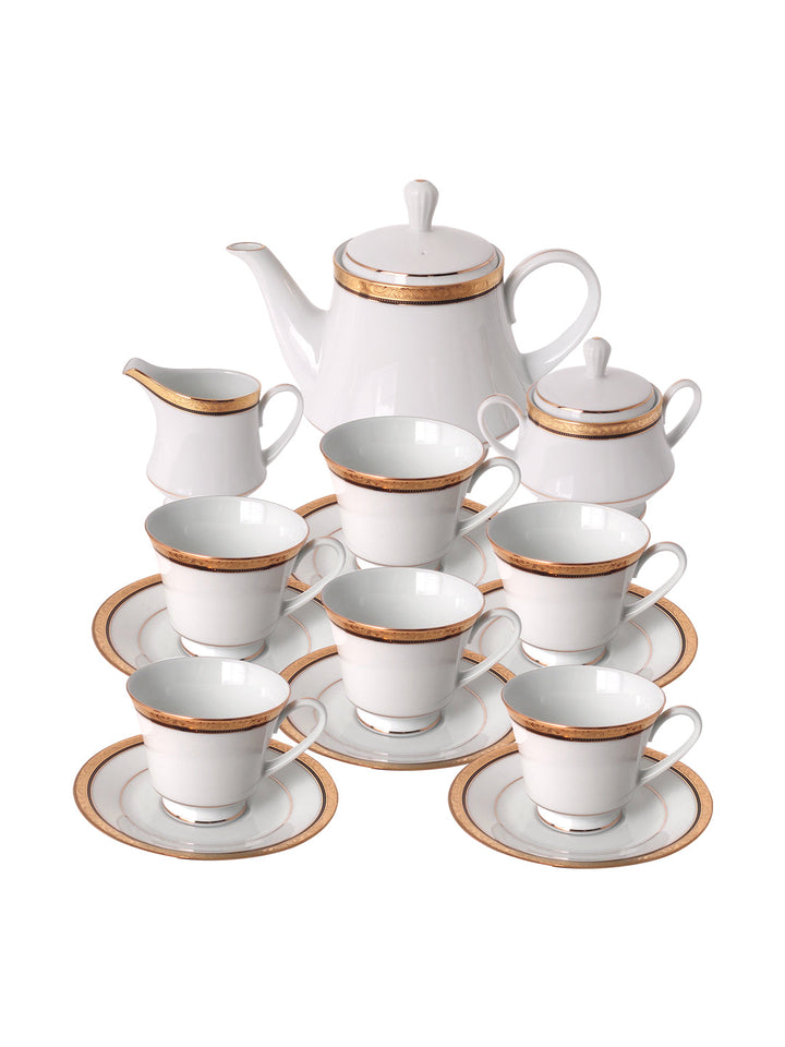• Net Qty: 17 Pcs Tea Set Includes 6 Cup and Saucer Set Tea Pot 1 Milk Pot 1 lid 1 Tea Pot 1 lid 1 Sugar Pot