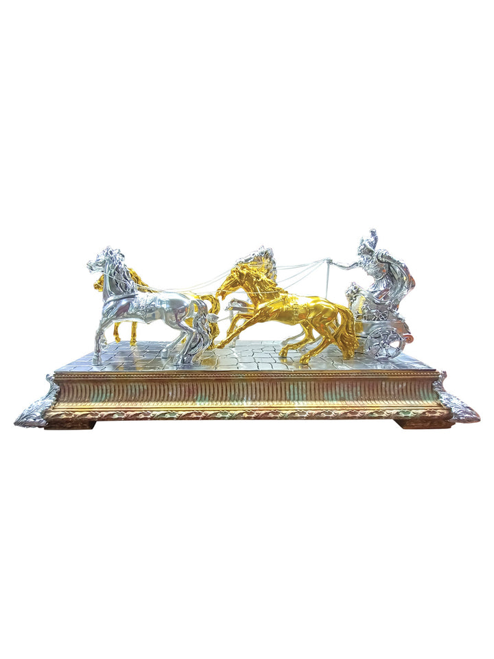 This Chariot 4 horses is a fabulous decorative showpiece for most homes.The fine finish and attractive look of it makes this horse chariot more desirable accessory for living and dining room. The detailing on its surface, lovely structure and carving deatil also adds to its beauty and it is a perfect masterpiece for all those who love to collect distinct showpieces.