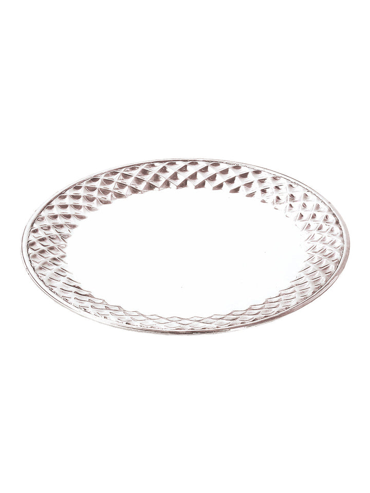 Softly curved corners create a vintage-inspired round tray from Ekaani. Shiningly polished, the tray has beautiful motif design bordered with daintily beaded layers. This is available in small size 21 CM. The wide open center of the tray beautifully takes engraving to create a personalized gift.