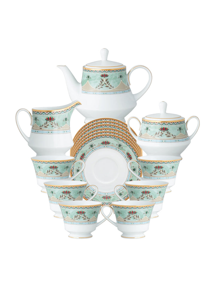 - Net Qty: 17 Pcs Tea Set Includes 6 Cup and Saucer Set Tea Pot 1 Milk Pot 1 lid 1 Tea Pot 1 lid 1 Sugar Pot
