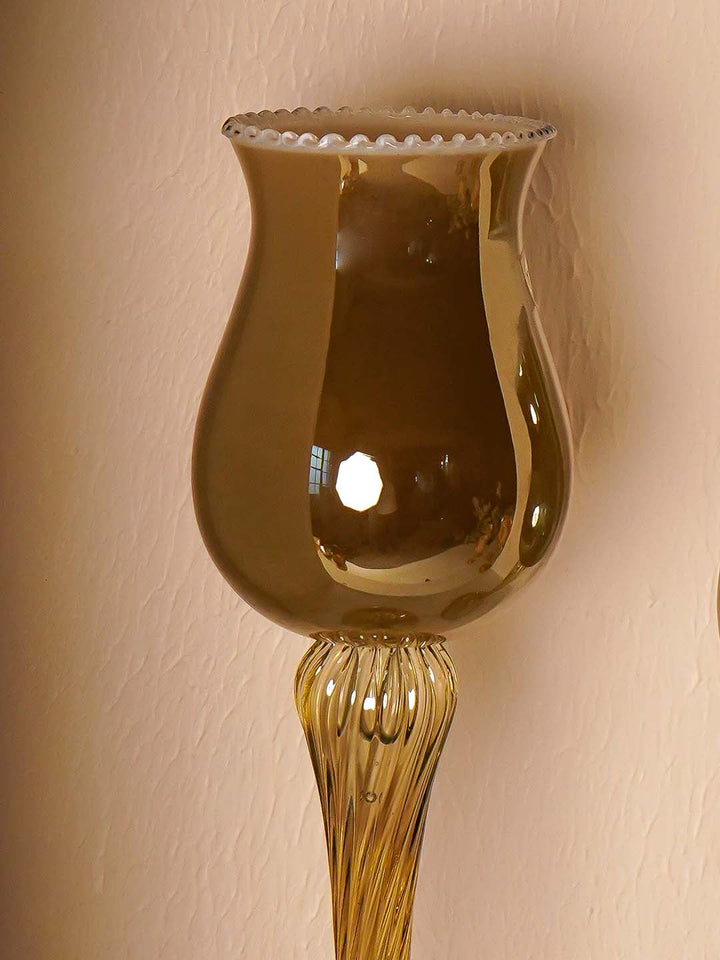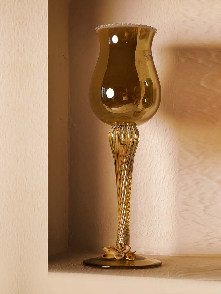 This elegant STELO ANTICO CANDLE STAND - BIG is a masterpiece of Italian-inspired craftsmanship. The design features a graceful tulip-shaped cup that delicately flares outward at the rim, perfect for holding pillar or taper candles. Crafted from high-quality amber-tinted glass, the stand exudes a warm golden glow that enhances any ambient lighting.
