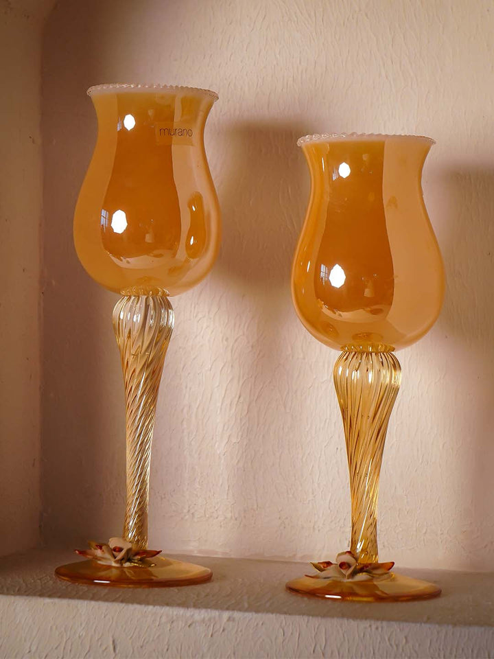 The Stelo Antico Honey Candle Stand showcases timeless Italian craftsmanship with its warm amber hue and elegant tulip-shaped design. The twisted glass stem adds a graceful touch, while the delicate floral motif at the base enhances its artistic appeal. Perfect for adding a soft, golden glow and refined charm to any sophisticated décor setting.