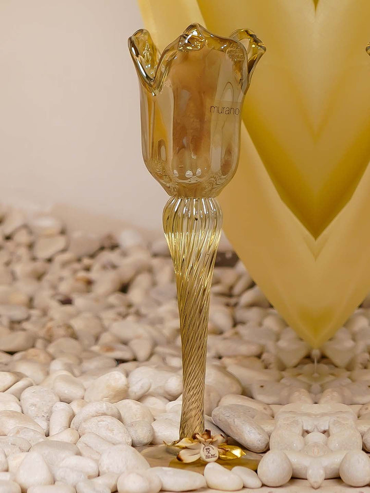 The Stelo Tulipano Grey Candle Stand is an exquisite piece of Italian artistry, inspired by the graceful form of a blooming tulip. Handcrafted from fine Murano glass, it features a smoky grey tone that exudes timeless elegance. The twisted glass stem and delicate floral embellishment at the base enhance its luxurious aesthetic—making it a stunning statement piece for refined interiors or special occasions.