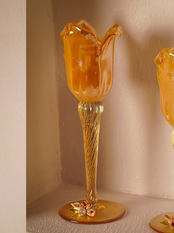 The Stelo Tulipano Honey Candle Stand is an exquisite piece of Italian artistry, inspired by the graceful form of a blooming tulip. Handcrafted from fine Murano glass, it features a smoky grey tone that exudes timeless elegance. The twisted glass stem and delicate floral embellishment at the base enhance its luxurious aesthetic—making it a stunning statement piece for refined interiors or special occasions.