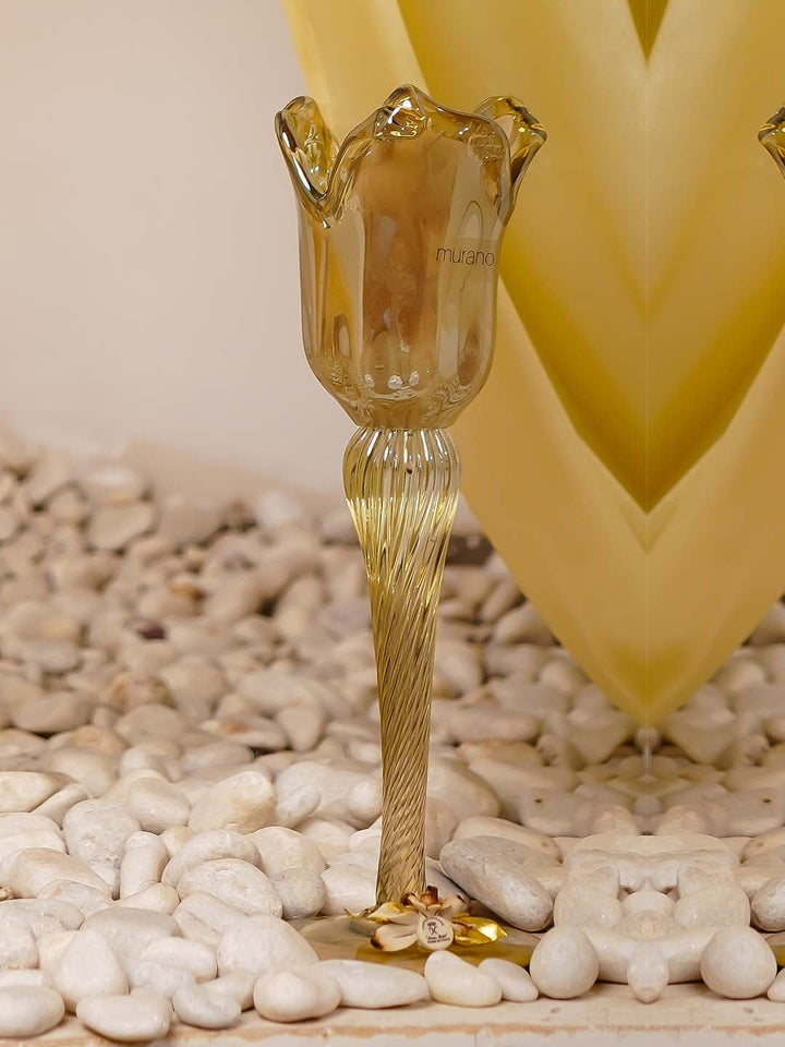The Stelo Tulipano Small Candle Stand captures the beauty of a blooming tulip in elegant Murano glass craftsmanship. Its soft golden hue and delicate petal-shaped top exude timeless charm, while the twisted stem and floral base add a touch of refinement. Perfect as a décor accent or for intimate candlelit settings, it brings sophistication and warmth to any space.