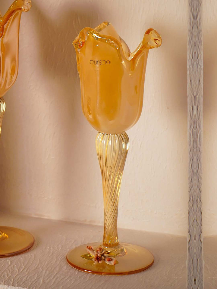 The Stelo Tulipano Honey Candle Stand radiates warmth and sophistication through its rich honey-toned Murano glass. Handcrafted with a gracefully twisted stem and tulip-shaped top, it beautifully captures the essence of Italian artistry. A delicate floral motif at the base adds a refined touch, making it a perfect accent for elegant interiors or a thoughtful luxury gift.