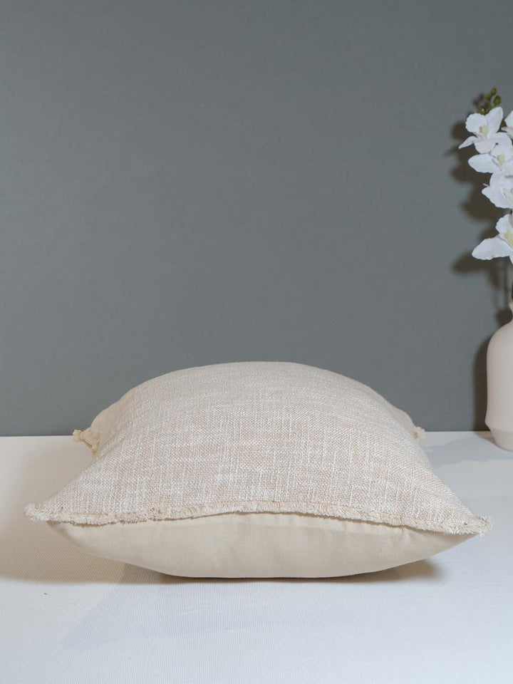 Ekaani Wild Whispers Lounge Collection Ivory & Gold Cushion Cover with Trim is a luxurious and stylish addition to any living space. Made from soft, textured fabric, it features a subtle gold thread work design that adds sophistication and warmth. The frayed edges and natural color palette contribute to a relaxed, bohemian vibe, making it perfect for enhancing comfort and style in your home.