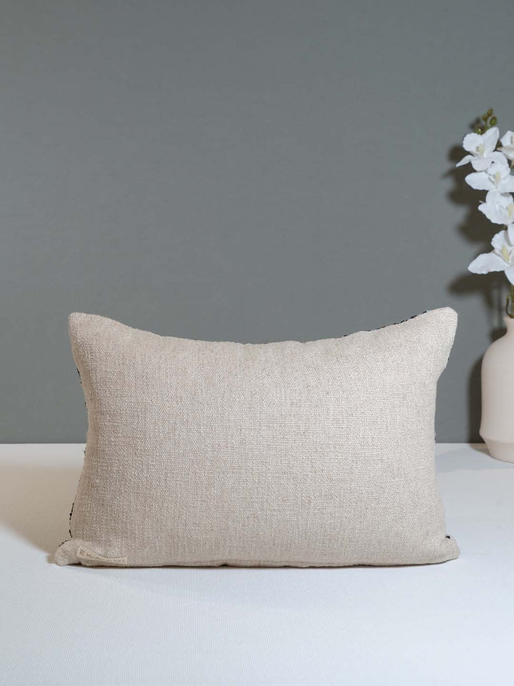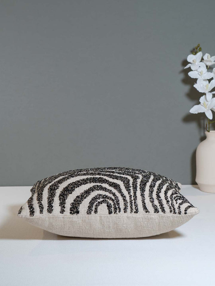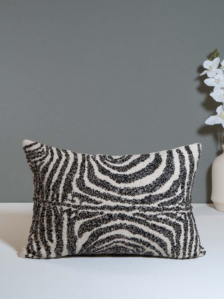 This elegant cushion cover from the Ekaani Wild Whispers Lounge Collection boasts a captivating black and white pattern inspired by zebras, expertly embroidered on a textured natural fabric. The striking contrast of colors and bold design gives your home a touch of wild and contemporary elegance.