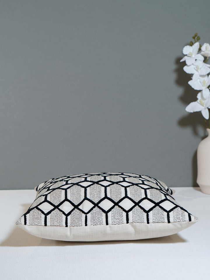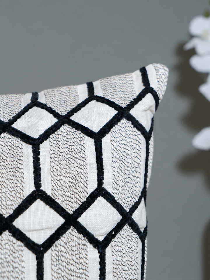 Ekaani Wild Whispers Lounge Collection Black & White Embroidered Cushion Cover is a sophisticated and refined accessory for your home. Adorned with a captivating black and white geometric embroidered pattern on a richly textured natural fabric, this cushion cover emanates a modern and stylish aesthetic. This item is an excellent choice for infusing your living environment with a touch of elegance.