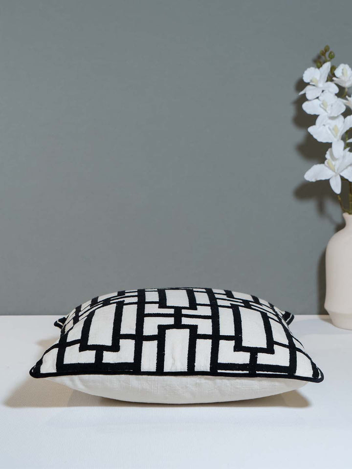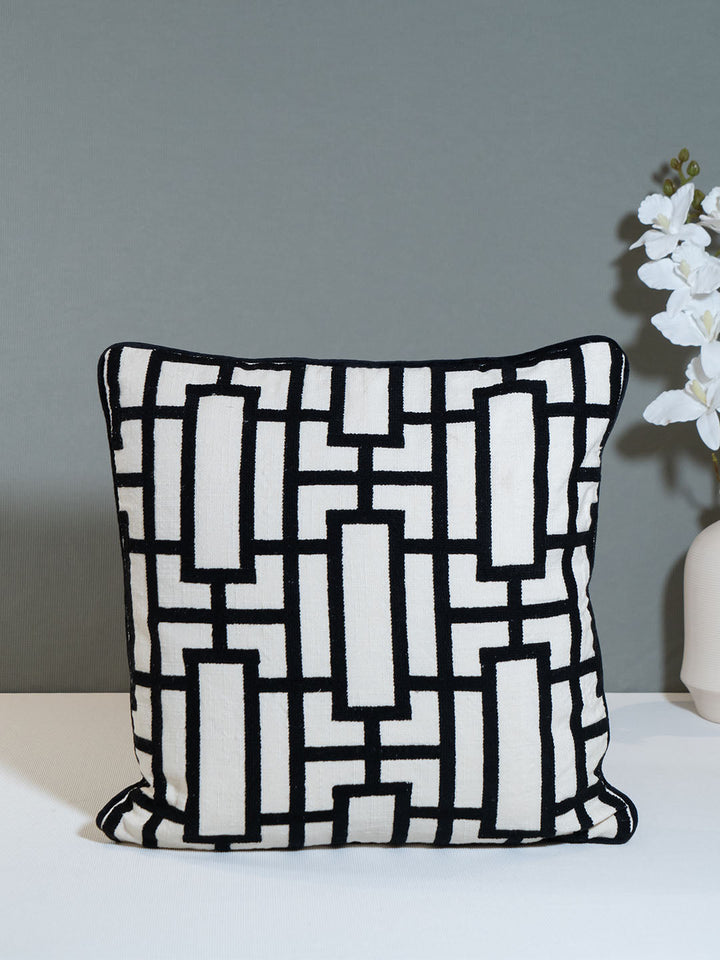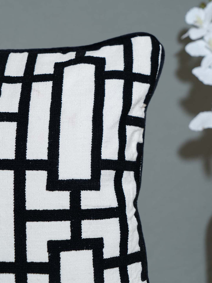 Ekaani Wild Whispers Lounge Collection Black & White Embroidered Cushion Cover is a fashionable and cozy piece for your home. The strong black and white geometric design, sewn onto a textured natural material, gives it a powerful visual effect. The edging adds an elegant touch, making it well-suited for contemporary or simple interior spaces.