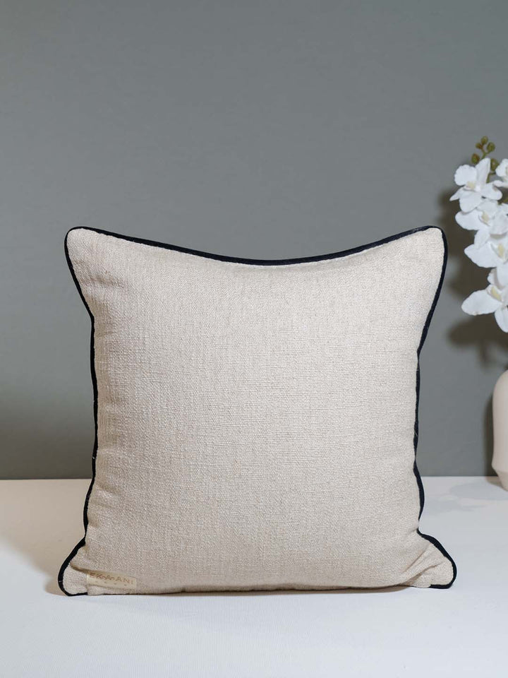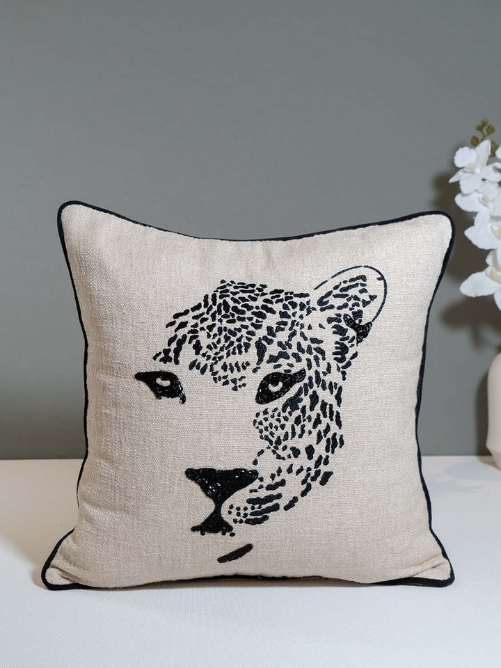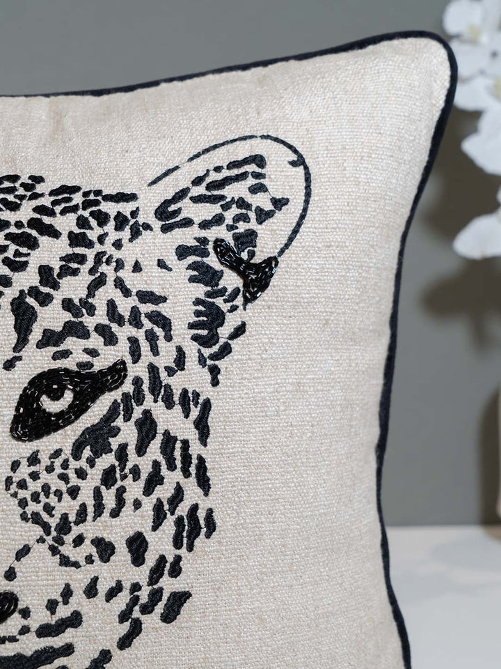 Ekaani Wild Whispers Lounge Collection Black & White Embroidered Cushion Cover is an attention-grabbing home accessory. It features an elaborately embroidered black and white leopard design on a textured natural fabric, producing a striking visual effect. Featuring stylish piping, this cushion cover can elevate contemporary or pared-down interiors, bringing distinctive style and coziness to any room.